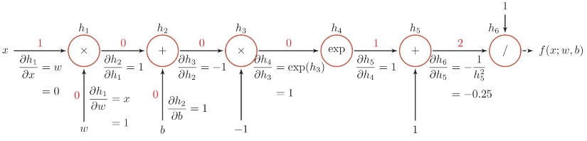 - 链式法则:\(\frac{\partial f(x;w,b)}{\partial w}=\frac{\partial f(x;w,b)}{\partial h_6} \frac{\partial h_6}{\partial h_5} \frac{\partial h_5}{\partial h_4} \frac{\partial h_4}{\partial h_3} \frac{\partial h_3}{\partial h_2} \frac{\partial h_2}{\partial h_1} \frac{\partial h_1}{\partial w}\)
