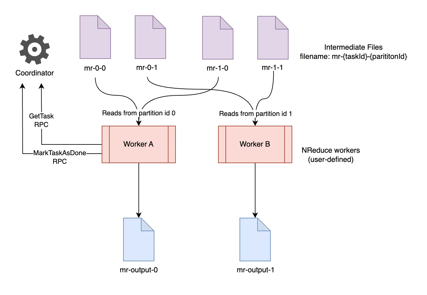 - 本次 Lab 只在同一台机器上运行,worker 会通过 RPC 与 coordinator 通信;
