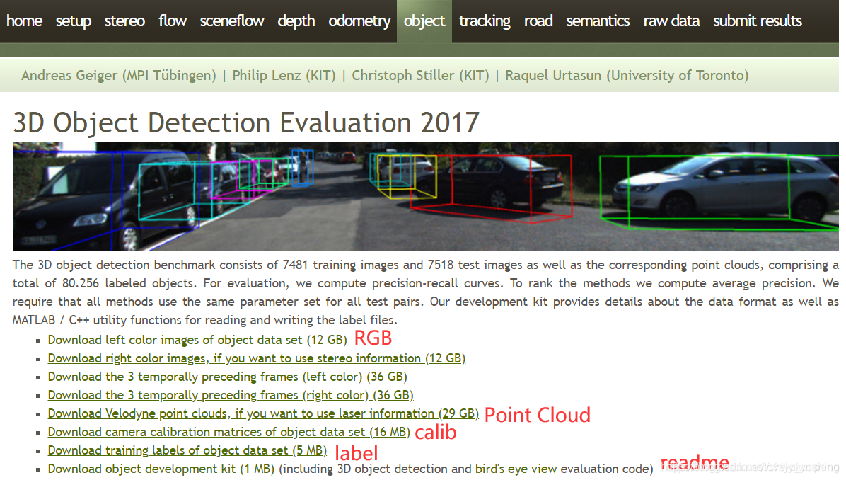 整个数据集由 389 对立体图像和光流图,39.2 km 视觉测距序列以及超过 200k 3D 标注物体的图像组成 [1] ,以 10Hz 的频率采样及同步。总体上看,原始数据集被分类为Road , City , Residential , Campus和 Person。对于 3D 物体检测,label 细分为 car, van, truck, pedestrian, pedestrian(sitting), cyclist, tram 以及 misc 组成。