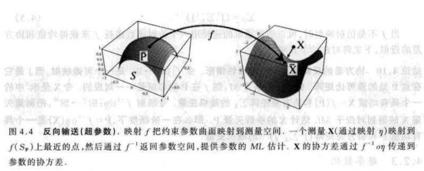 - 协方差的反向输送——超参数化情形。令 \(f:IR^M \to IR^N\) 是一个可微映射,它把一组参数 \(\bar{\mathbf{P}}\) 映射到测量矢量 \(\bar{\mathbf{X}}\),令 \(S_\mathbf{p}\) 是嵌入 \(IR^M\) 中过点 \(\bar{\mathbf{P}}\) 的 d 维光滑流形并使得映射 \(f\) 在流形 \(S_\mathbf{p}\) 上 \(\bar{\mathbf{P}}\) 的一个邻域内是一一对应的,\(f\) 把 \(S_\mathbf{p}\) 局域地映射到 \(IR^N\) 上到流形 \(f(S_\mathbf{p})\)。函数 \(f\) 有一个局部逆函数,记为 \(f^{-1}\),它限制在曲面 \(f(S_\mathbf{p})\) 上 \(\bar{\mathbf{X}}\) 的一个邻域内,定义 \(IR^N\) 上的一个具有均值 \(\bar{\mathbf{X}}\) 和协方差 \(\sum_{\mathbf{x}}\) 的高斯分布,并令 \(\eta: IR^N \to f(S_\mathbf{p})\) 把 \(IR^N\) 上的点映射到 \(f(S_\mathbf{p})\) 上并在 Mahalanobis 范数 \(\parallel \cdot \parallel_{\sum_{\mathbf{x}}}\) 意义下最近的点,\(IR^N\) 上具有协方差矩阵 \(\sum_\mathbf{x}\) 的概率分布通过 \(f^{-1} \small\circ \eta\) 诱导 \(IR^M\) 上的概率分布,它在一阶精度下的协方差矩阵是