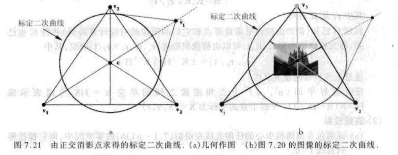 - 一张平面的法线方向的消影点 \(\mathbf{v}\) 可以按公式 \(\mathbf{v}=\omega^*\mathbf{l}\) 由平面的消影线 \(\mathbf{l}\) 获得;反之有 \(\mathbf{l}=\omega \mathbf{v}\)
