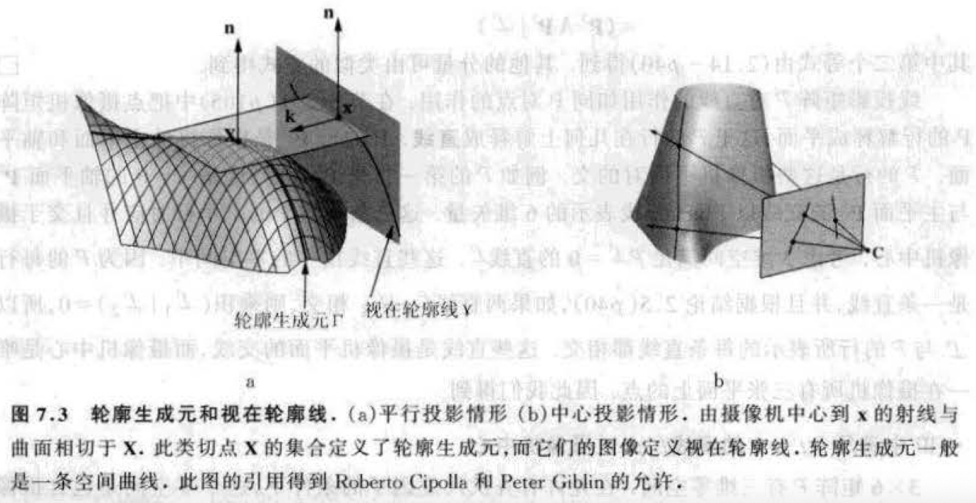 - 轮廓生成元 \(\Gamma\) 仅取决于摄像机中心与曲面的相对位置,而与图像平面无关