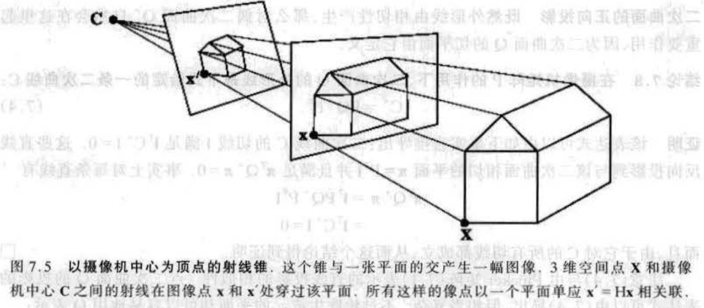 - 3 维空间的物体和摄像机中心确定了一个射线集合,而这些射线与一张平面的交就产生该物体的图像,这个集合通常称为射线锥