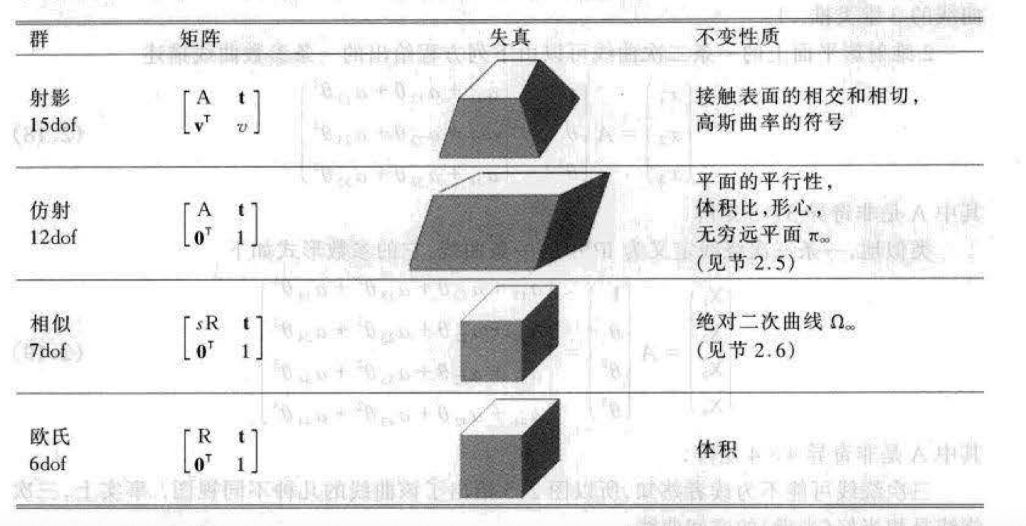 - 在射影变换 \(H\) 下,无穷远平面 \(\mathbf{\pi}_\infty\) 是不动平面的充要条件是 \(H\) 是一个仿射变换