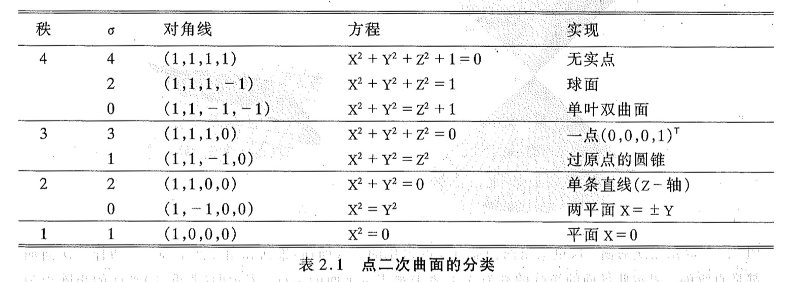 - \(IP^3\) 中,二次曲面由下列方程定义:\(\mathbf{X}^{\top} Q\mathbf{X}=0\),其中 \(Q\) 是一个 \(4 \times 4\) 的对称矩阵