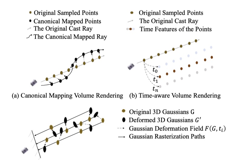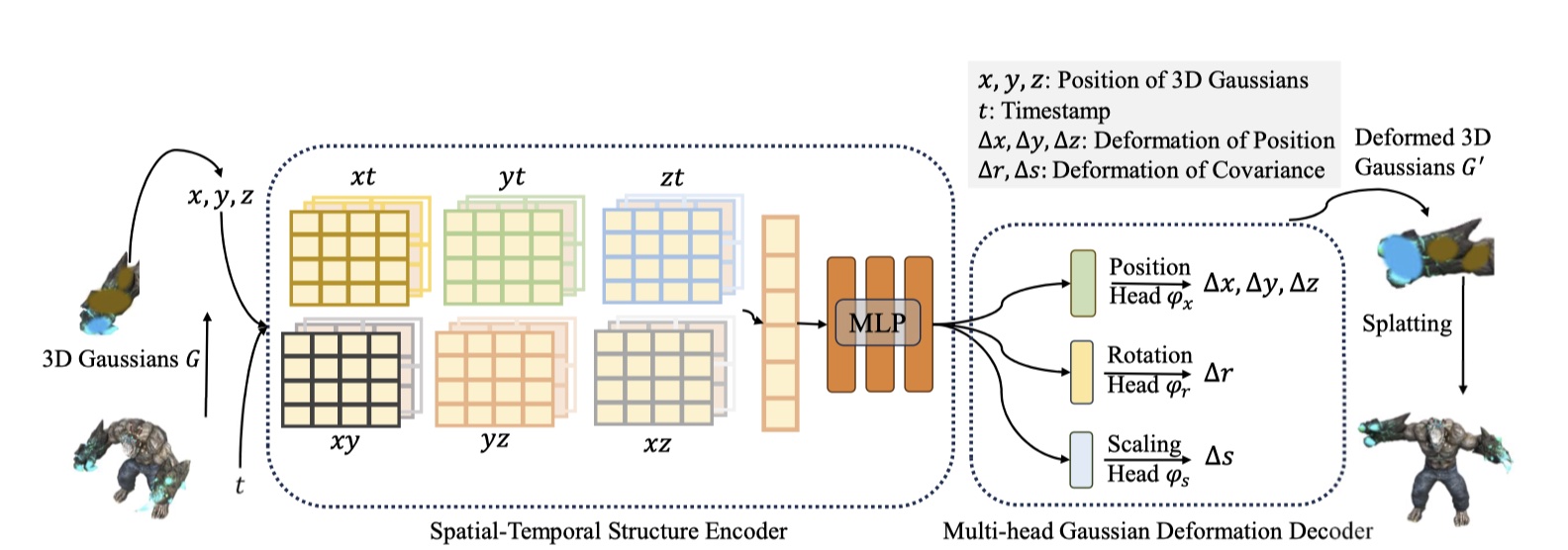 - 3D 高斯变形场变化量 \(\Delta \mathcal{G} = \mathcal{F}(\mathcal{G}, t)\)