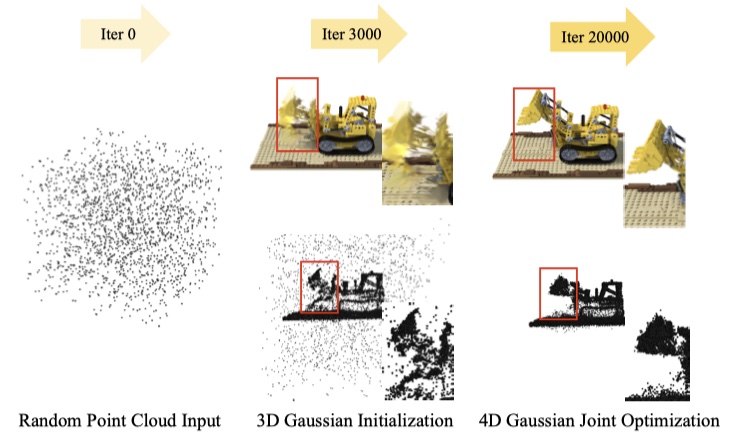 - 初始化阶段:主要优化静态场景的表示,即只优化 3D Gaussians 的参数;