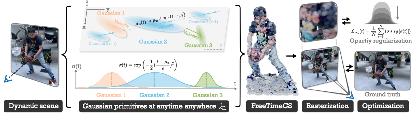- 为表示动态 3D 场景,定义了可出现在任何空间位置和时间步的 Gaussian Primitives;