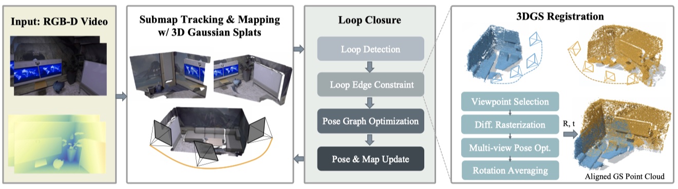 - 当创建新的 submap 时会触发 loop closure,构建包含所有历史 submap 的位姿图,然后用 3DGS 配准计算位姿图的回环边约束,最后执行位姿图优化;