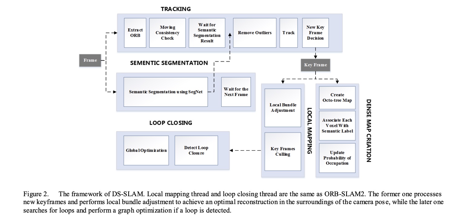 - 基于 ORB-SLAM2 提出了动态环境中的完整语义 SLAM 系统(DS-SLAM