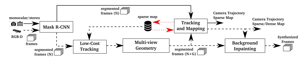 DynaSLAM 是可以用于单目,双目,RGB-D 的动态 SLAM 系统,相当于是在 ORB-SLAM2 上加了一个前端的模块,上面的两个挑战,这篇论文都给出了对应的解决办法。