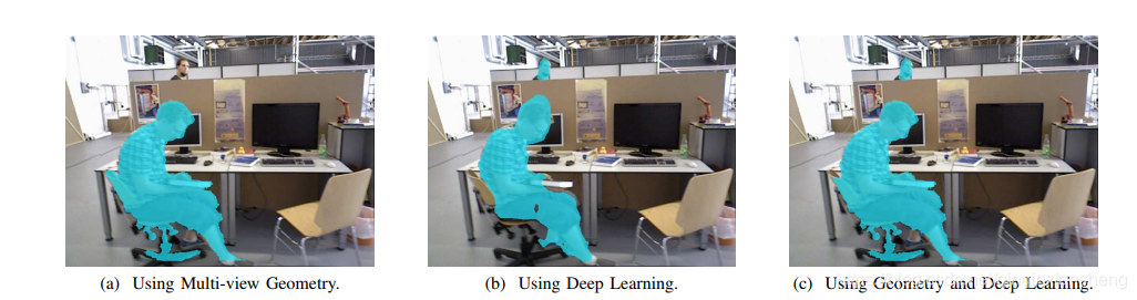 - 多视图几何:能识别出“可以被移动”的物体,但需要有多视图才能进行初始化。在图 4a 中看到,不仅检测到了图像前面的人,而且还检测到了他所拿的书和他所坐的椅子;但是远处的人并没有被检测到,原因有二:RGB-D 相机在测量远处物体的深度时会有困难;其次,可靠的特征位于确定的,因此是附近的图像部分。