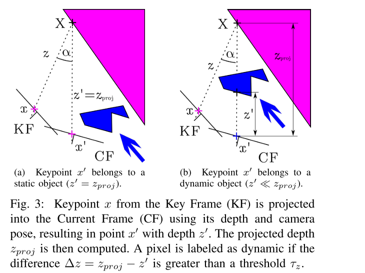 ) 。如果 \(\Delta z > \tau_z\),关键点 \(x^\prime\) 就会被视为动态物体。为了一个好的精度和召回率,通过最大化 \(0.7 * Presion + 0.3 * Recall\),将 \(\tau_z\) 定为 0.4m。