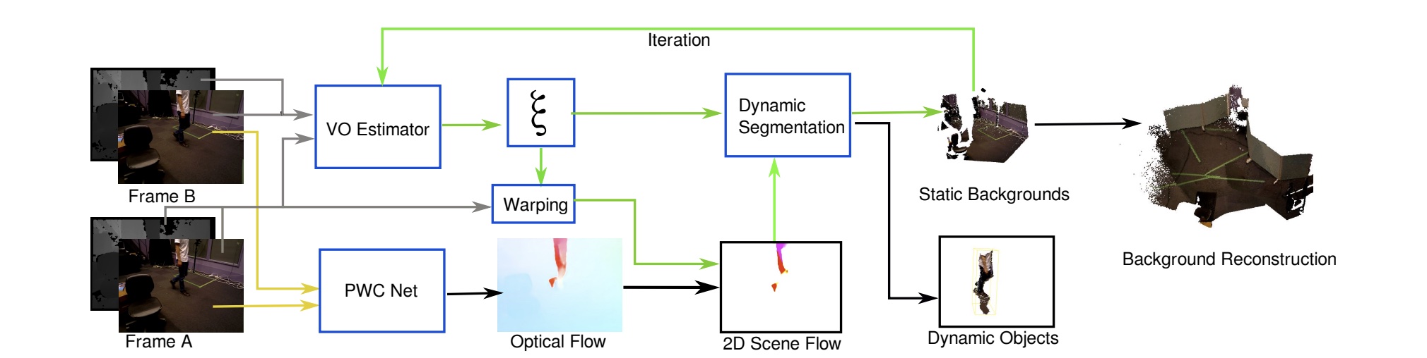 - 输入两个连续的 RGB-D 帧 A 和 B,RGB 图像首先被馈送到 PWC-net 用于光流估计。