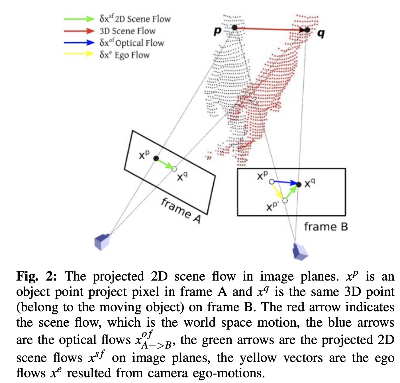 - \(x^q\) 是帧 B 中的同一个 3D 点(属于移动对象)