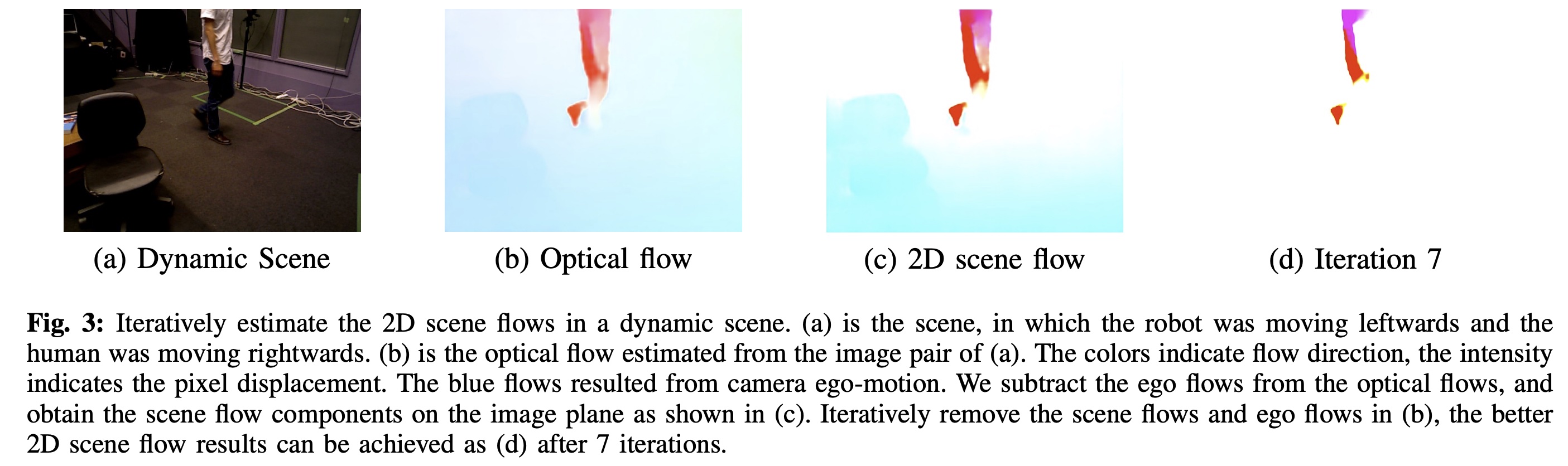 - 下图是迭代估计动态场景中的 2D 场景流 .(a) 是机器人向左移动而人类向右移动的场景 .(b) 是根据 (a) 的图像对估计的光流 . 颜色表示流动方向 , 强度表示像素位移 . 蓝色的流动是相机自我运动的结果 . 我们从光流中减去自我流 , 得到像平面上的场景流分量 , 如 (c) 所示 . 在 (b) 中迭代地移除场景流和 \(x^e\) 在 7 次迭代之后就可以获得更好的 2D 场景流结果 , 如 (d).