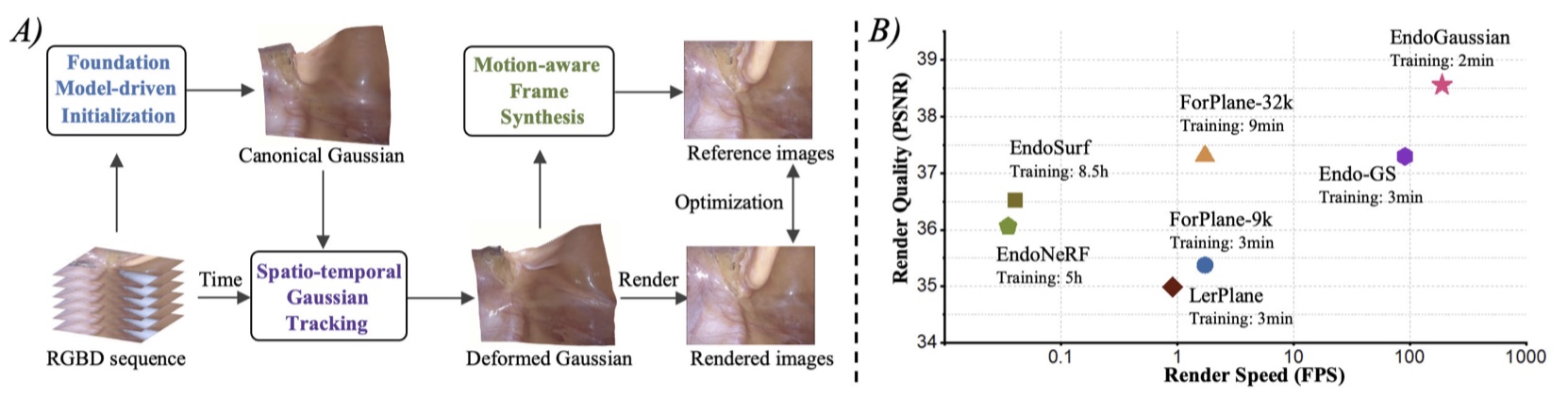 提出 EndoGaussian 框架,整合了 3DGS 的优势,实现高保真度的组织重建、高效训练和实时渲染;