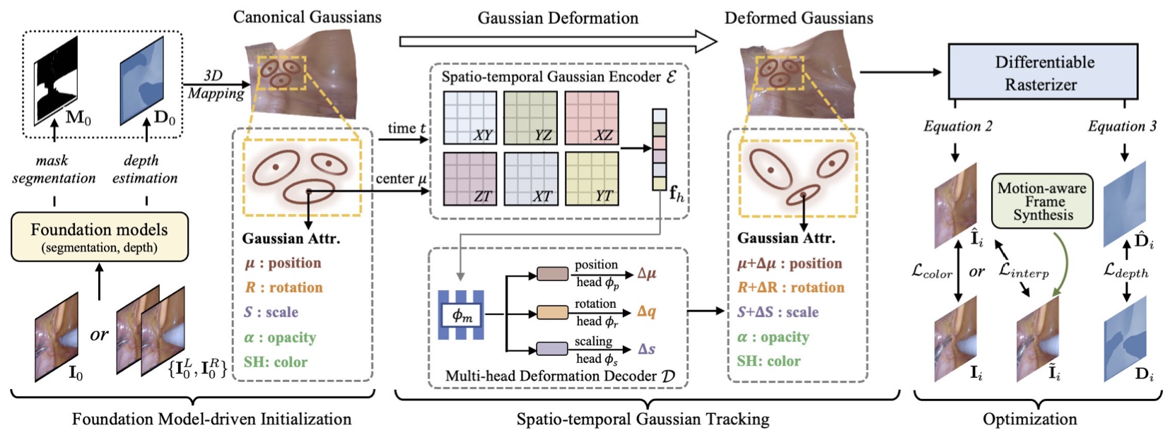 ) ,由于组织变形和光照变化,无法生成密集且准确的点,3DGS 的学习过程在很大程度上依赖于初始化点的数量和准确性; - 原始 3DGS 是为静态场景设计的,如果采用 MLP 来跟踪每个高斯的动态,MLP 缺乏从输入中明确编码时空关系的固有能力,很难应用到内窥镜中。
