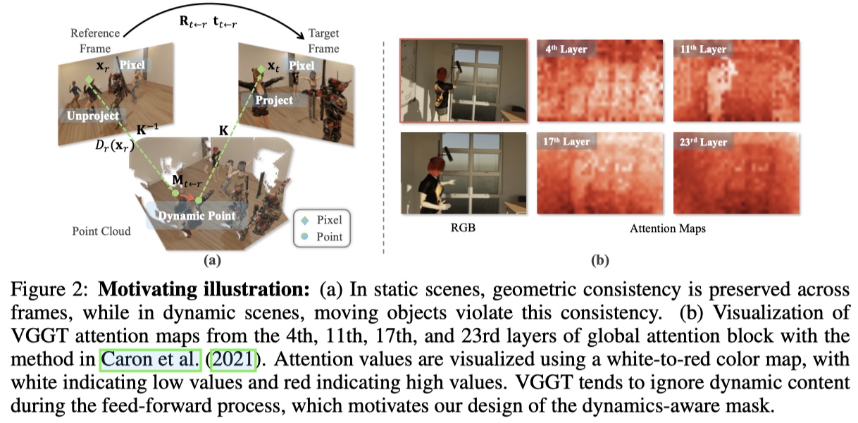 - 通过观察 VGGT 的关键层,发现与静态区域相比,动态区域的激活较弱,这表明 VGGT 倾向于忽略动态内容;