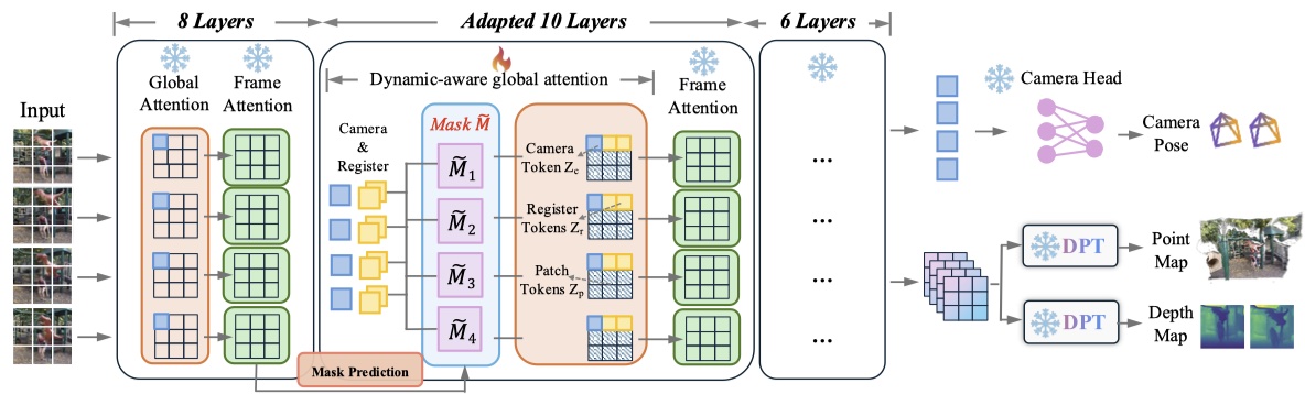 - 第一段包含 8 层(每层一个 Global Attention Block 和一个 Frame Attention Block),输出送入动态掩码预测模块,会生成一个 Mask;