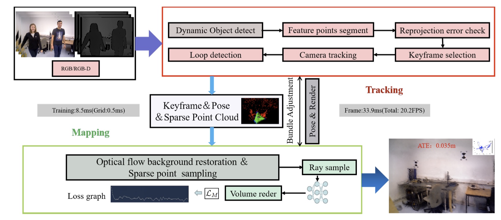 - 提出一种基于动态掩码的渲染损失,包括运动一致性损失、深度损失和颜色损失,以约束动态物体的渲染鬼影并消除遮挡。
