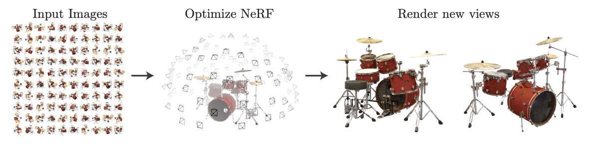 - 通过优化一组稀疏输入视角的连续体积场函数,实现合成复杂场景的新视角。