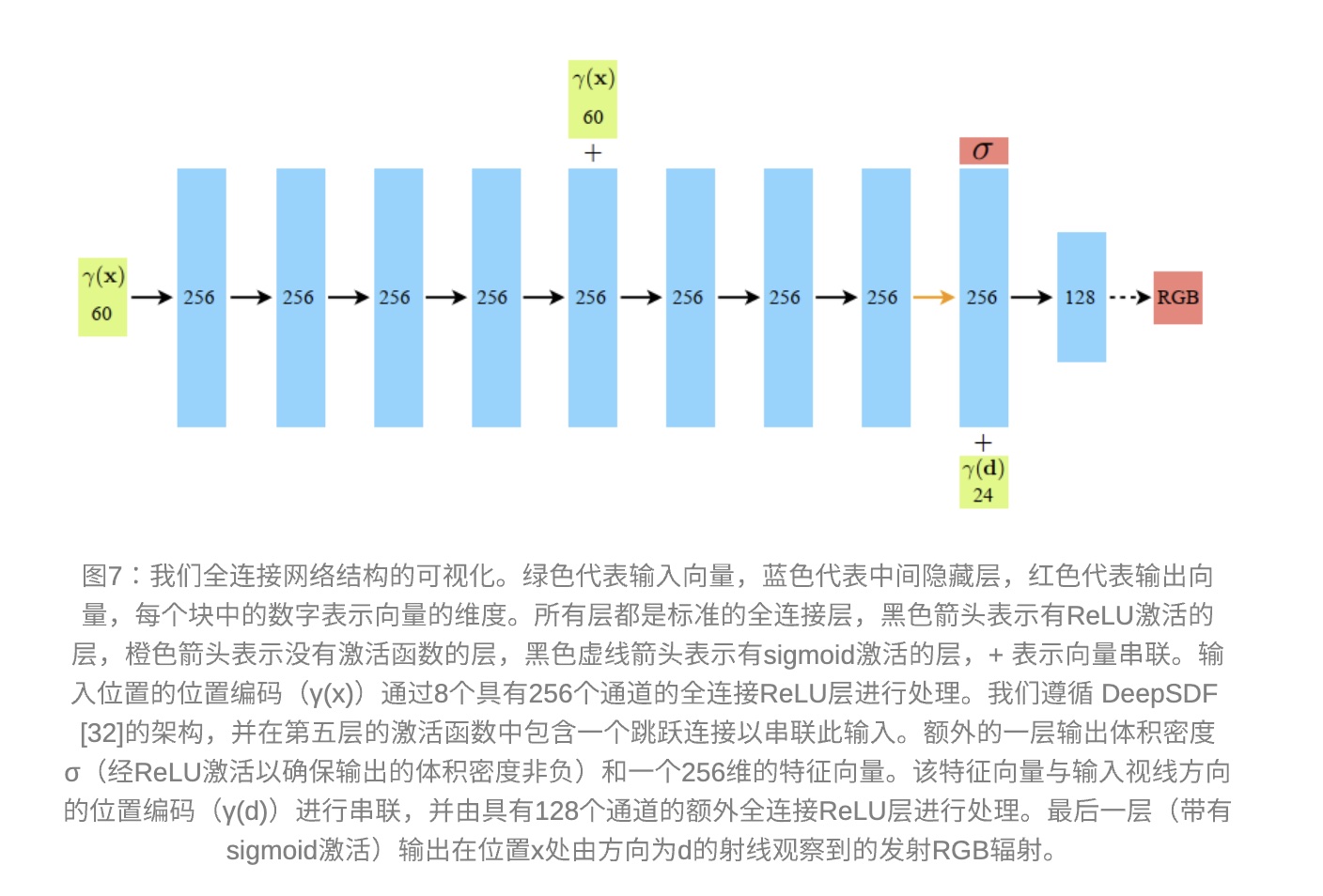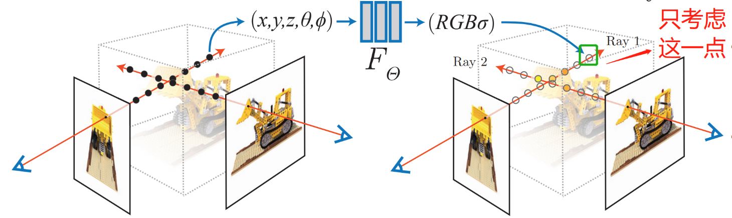- 输入 \(x,y,z,\theta,\phi\) 是空间位置和观察方向,输出 \(RGB, \sigma\) 是颜色和密度,就能算出场景中的颜色和密度