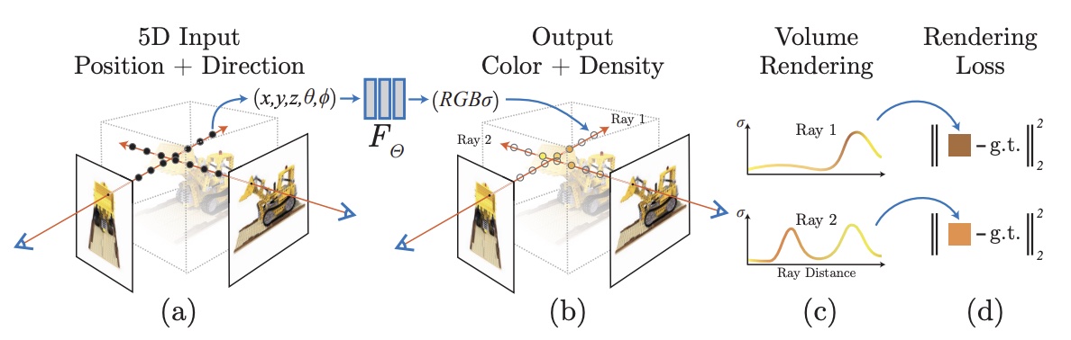 ) ,输出是该空间位置处的体积密度和视角相关的辐射强度。 - 通过查询相机光线上 5D 坐标来合成视角,并用体渲染技术将输出的颜色和密度投影到图像中。