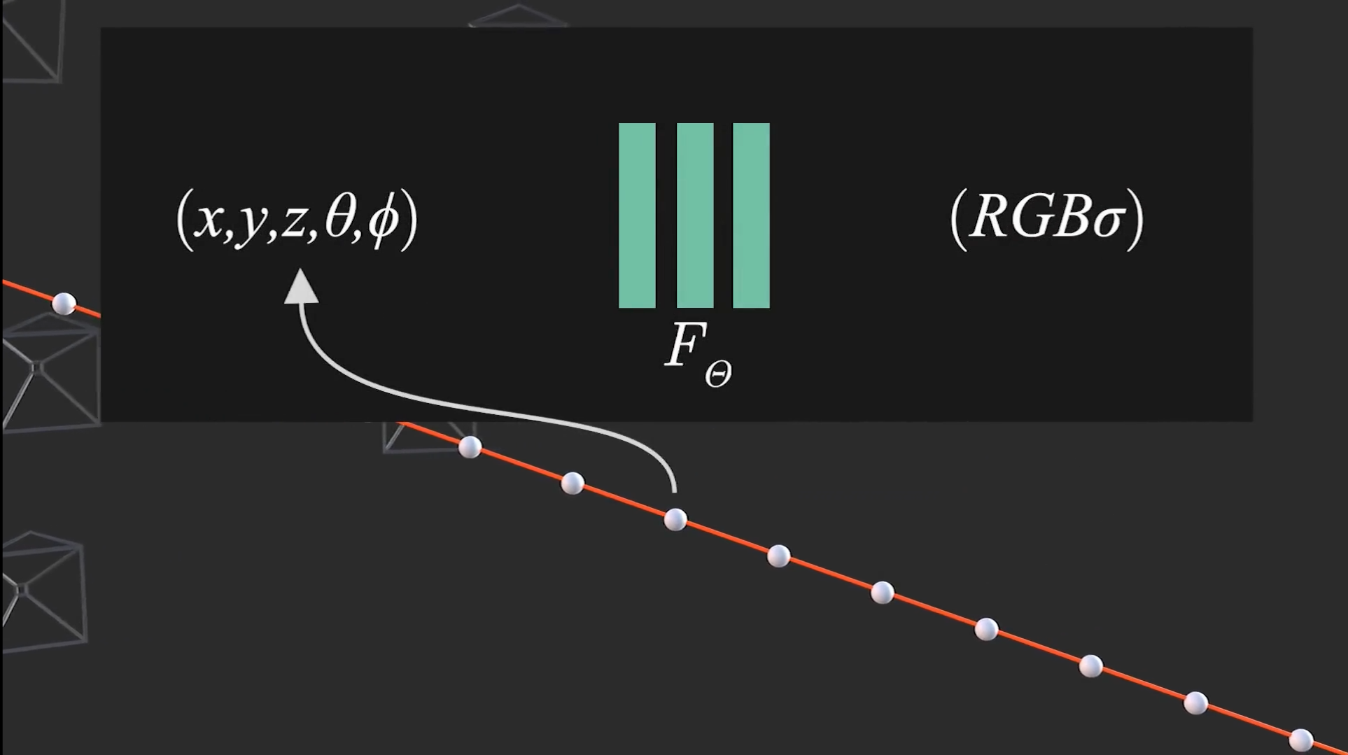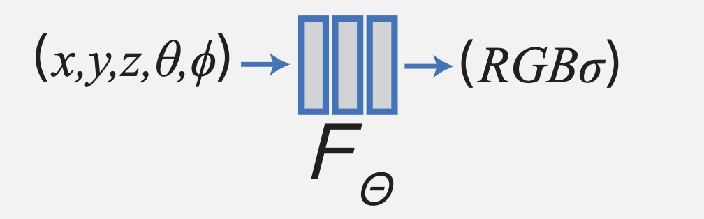 - 建立一个神经网络 \(F\),输入 \((x,y,z,\theta,\phi)\) 是空间位置和观察方向,输出 \(RGB,\sigma\) 颜色和密度。就能算出场景中每个位置的颜色和密度。
