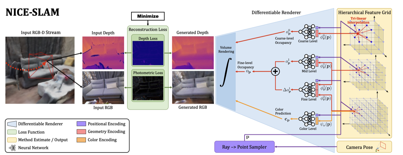 - 最大的创新点:multilevel grid-based features(基于网格的多层特征),其余的 idea 就是优化方法,如何 mapping、tracking、如何加速,联合训练 + 分层训练,nerf 采样方法等等