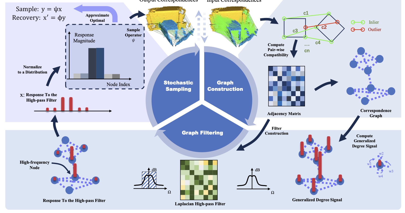 - 随机采样:采用一种随机策略。考虑从图滤波中获取的 \(\pi_i\) 作为采样分布,并在初始对应集上应用概率采样,从而产生一个表示为 \(C_{\text{sampled}} \cdot \pi_i\) 的采样集。近似于采样算子,它在最小化重构误差方面是最优的,并且速度更快。