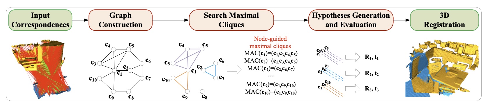 - 引入了一种 MAC 的假设生成方法。相比下先前的最大团约束,MAC 能够在图中挖掘更多的局部信息。证明了即使在存在大量离群值的情况下,MAC 生成的假设也具有很高的准确性。