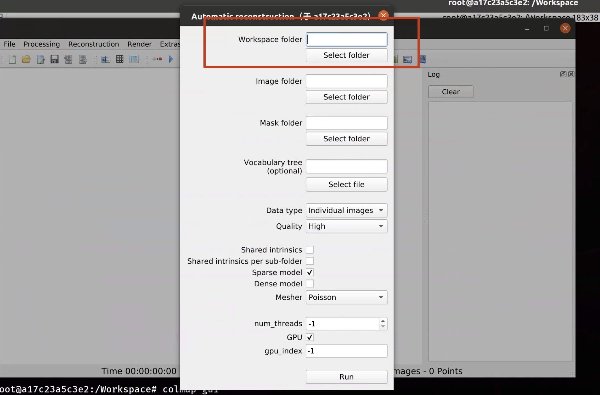 Reconstruction > Automatic Reconstruction进行一系列基本设置后,输出的结果会写在workspace folder中(如果图像在path/to/project/images中,那么就应该选择path/to/project作为workspace)