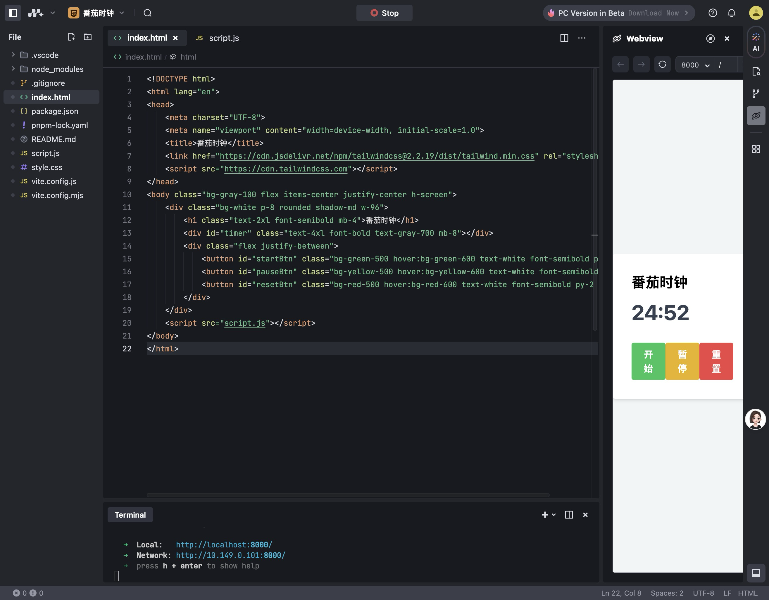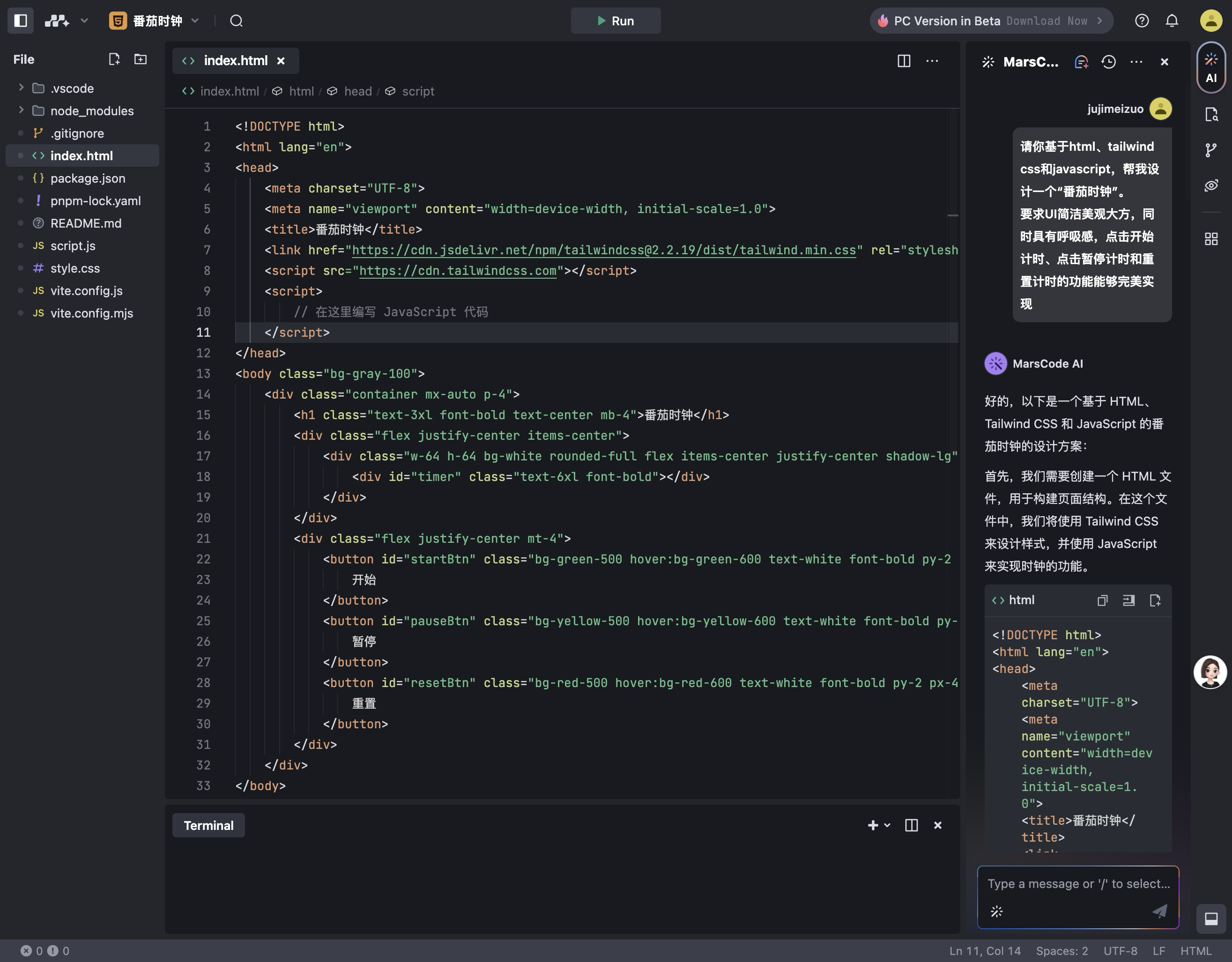 速通 AI 辅助番茄时钟开发 ¶ 约 100 个字 2 行代码 2 张图片 预计阅读时间不到 1 分钟 Abstract 学习自 5 分钟速通 AI 辅助番茄时钟开发 注册 & 使用 MarsCode IDE ¶ 官网:MarsCode 进行工作台打开在线 IDE Pipeline¶ 选择 “HTML / CSS / JS” 项目,点击 “创建” 按钮创建项目 右侧 AI 对话区下方对话框输入 Prompt: 请你基于html、tailwind css和javascript,帮我设计一个“番茄时钟”。 要求UI简洁美观大方,同时具有呼吸感,点击开始计时、点击暂停计时和重置计时的功能能够完美实现。 将返回的 html 和 js 文件 copy 到项目中 启动! 结果展示 ¶