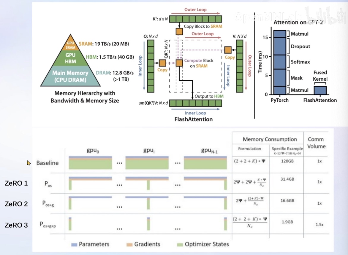 DeepSpeed ZeROZeRO优化,通过将训练过程中的参数、梯度和优化器状态切片保存,能够在多 GPU 训练时显著节省显存- 除了将训练中间状态切片外,