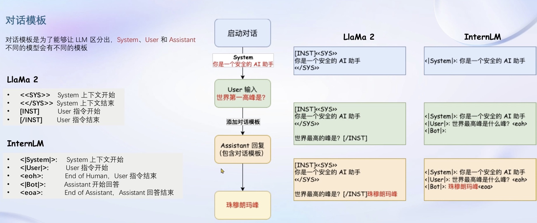 System给定一些上下文,比如“你是一个安全的 AI 助手”User实际用户,会提出一些问题,比如 “世界第一高峰是”Assistant根据 User 的输入,结合 System 的上下文信息,做出回答,比如 “珠穆朗玛峰”