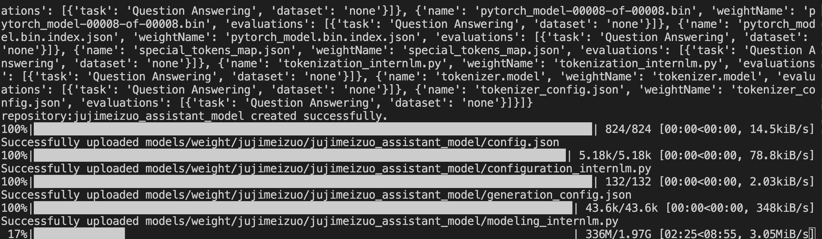 - 通过 scp 将 hf 文件夹下载到本地,进入 HuggingFace 新建 model,上传模型文件。Adapter 权重地址:https://huggingface.co/jujimeizuo/assistant-jujimeizuo/tree/main