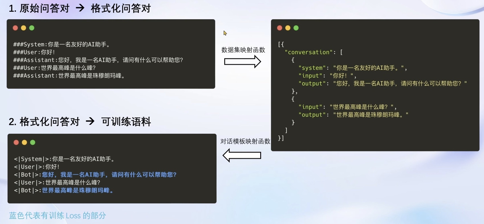 ) ,而不是问题(Input) ,训练时只会对答案(Output)部分计算 Loss - 训练时,会和推理时保持一致,对数据添加相对应的对话模版