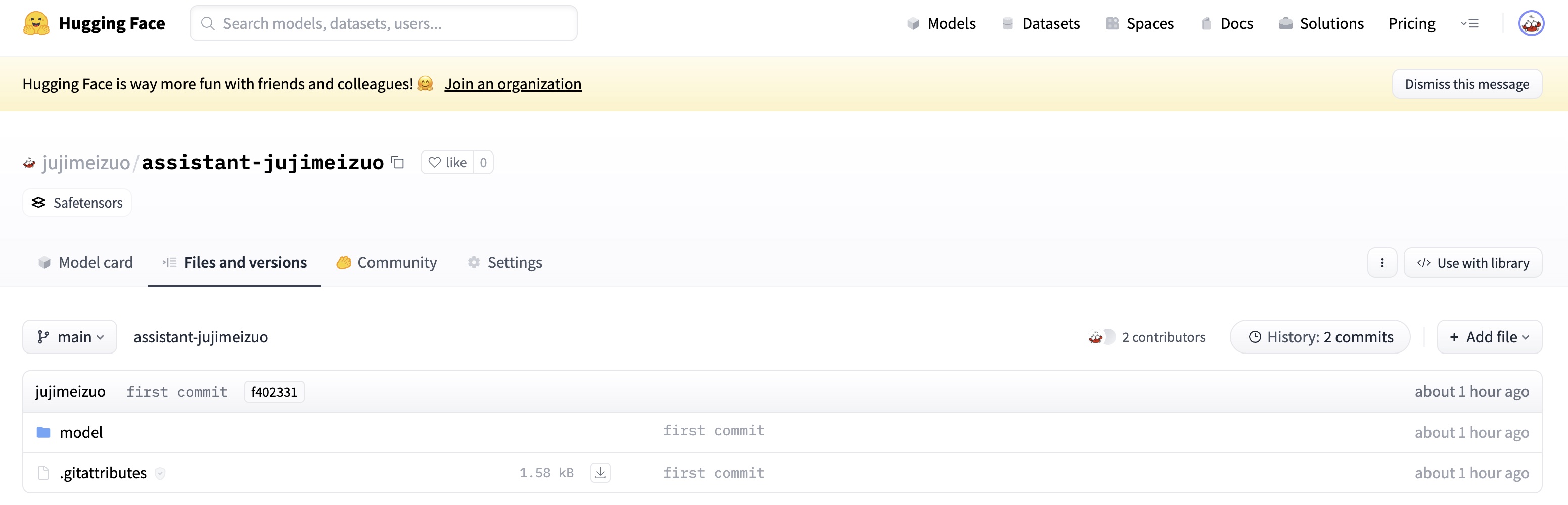 - 通过 scp 将 hf 文件夹下载到本地,进入 HuggingFace 新建 model,上传模型文件。Adapter 权重地址:https://huggingface.co/jujimeizuo/assistant-jujimeizuo/tree/main