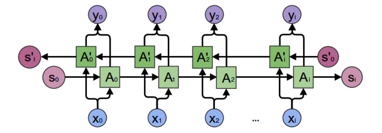 现在可以看出一般的规律:正向计算时,隐藏层的值 \(S_t\) 与 \(S_{t-1}\) 有关;反向计算时,隐藏层的值 \(S_t^\prime\) 与 \(S_{t+1}^\prime\) 有关;最终的输出取决于正向和反向计算的加和。现在,仿照公式 1 和公式 2,写出 BRNN 的计算公式:
