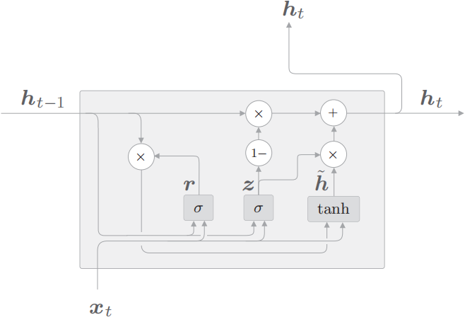 GRU 中进行的计算由上述 4 个式子表示(这里 \(x_t\) 和 \(h_{t−1}\) 都是行向量
