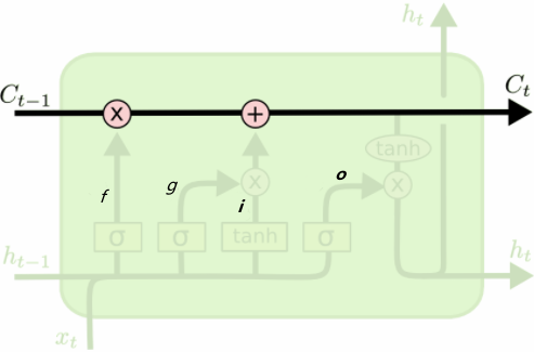 记忆单元状态的计算公式:\(公式1:c_{t}=f_{t} \odot c_{t-1}+i_{t} \odot g_t\)