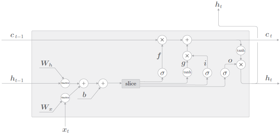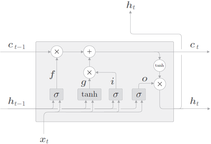 - LSTM 的输出有两个:当前时刻的 LSTM 输出值 \(h_t\)、和当前时刻的记忆单元向量 \(c_t\)。