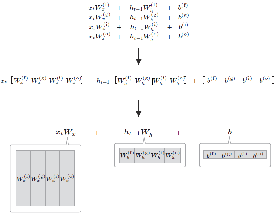 我们来看公式 2、3、4、5,都是型如 \(xW_x+hW_h+b\) 的格式,因此可以整合为通过一个式子进行,如下图所示: