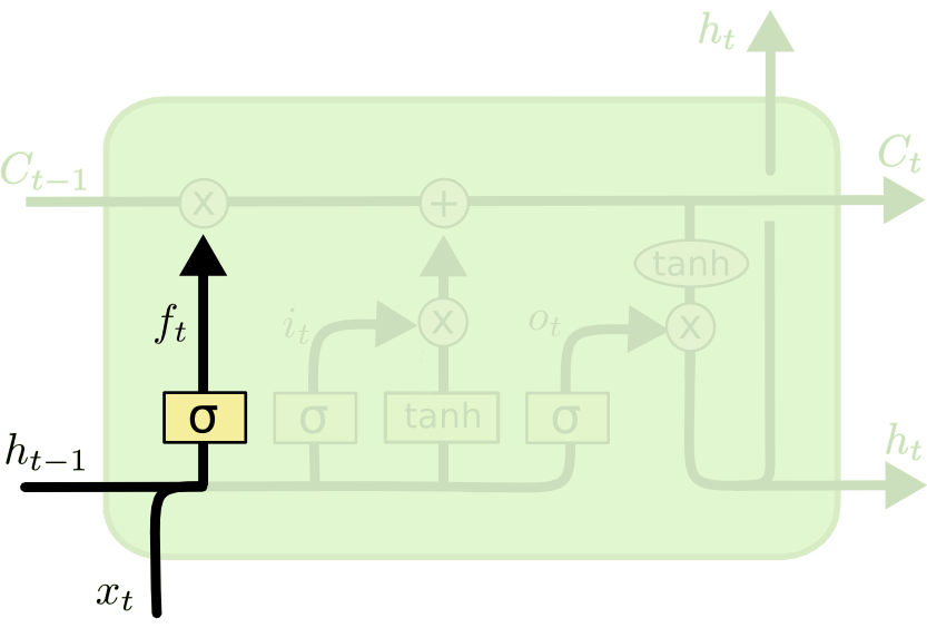 遗忘门的计算公式:\(公式2:f_t=\sigma (x_tW_x^{(f)}+h_{h-1}W_h^{(f)}+b^{(f)})\)