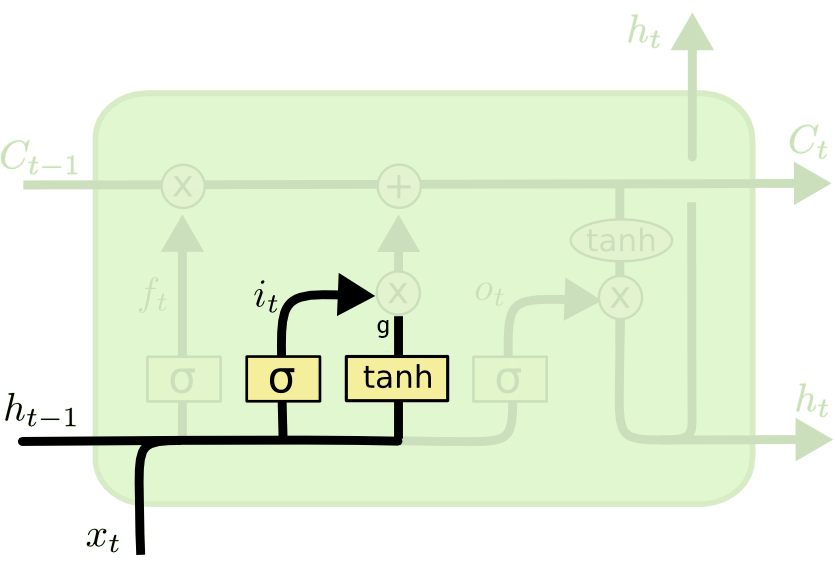 \(\tilde{C}_t\) 表示单元状态更新值,有输入数据 \(x_t\) 和隐节点 \(h_{t-1}\) 经由一个神经网络层得到,单元状态更新值的激活函数通常使用 tanh。\(i_t\) 叫做输入门,同 \(f_t\) 一样也是一个元素介于 (0~1) 区间内的向量,同样由 \(x_t\) 和 \(h_{t-1}\) 经由 sigmoid 激活函数计算而成。