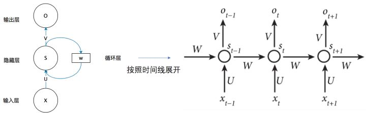 - 隐藏层有两个输入,第一是 U 与 \(x_t\) 向量的乘积,第二是上一隐藏层输出的状态 \(s_{t-1}\) 与 W 的乘积。等于上一个时刻计算的 \(s_{t-1}\) 需要缓存一下,在本次输入 \(x_t\) 一起计算,共同输出最后的 \(o_t\)。