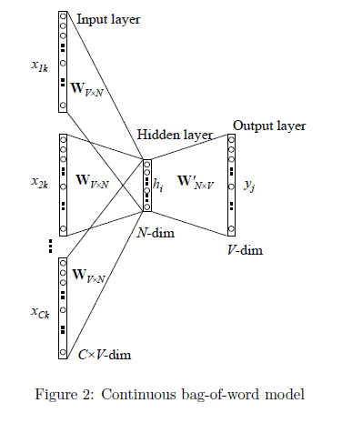 - 初始化一个权重矩阵 \(W_{V \times N}\),然后用所有输入的 One-Hot 编码词向量左乘该矩阵,得到维数为 N 的向量 \(w_1,w_2,...,w_c\),这里的 N 由自己根据任务需要设置。