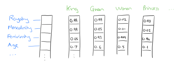 下图是采用 Distributed representation 的一个例子,我们将词汇表里的词用 "Royalty","Masculinity", "Femininity" 和 "Age"4 个维度来表示,King 这个词对应的词向量可能是 (0.99,0.99,0.05,0.7)。当然在实际情况中,我们并不能对词向量的每个维度做一个很好的解释。