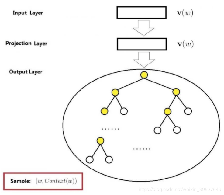 具体来说,这棵哈夫曼树除了根节点以外的所有非叶节点中都含有一个由参数 \(\theta\) 确定的 sigmoid 函数,不同节点的 \(\theta\) 不一样。训练时隐藏层的向量与这个 sigmoid 函数进行运算,根据结果进行分类,若分类为负类则沿左子树向下传递,编码为 0;若分类为正类则沿右子树向下传递,编码为 1。最终到达叶节点,叶节点的向量即为输出的词向量。